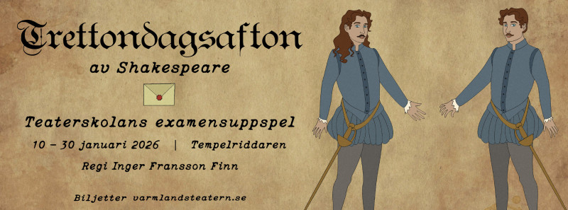 Varmt välkomna när deltagarna i D-kursen från Värmlandsteaterns teaterskola uppför sin examensföreställning Trettondagsafton av William Shakespeare, i regi av Inger Fransson Finn.